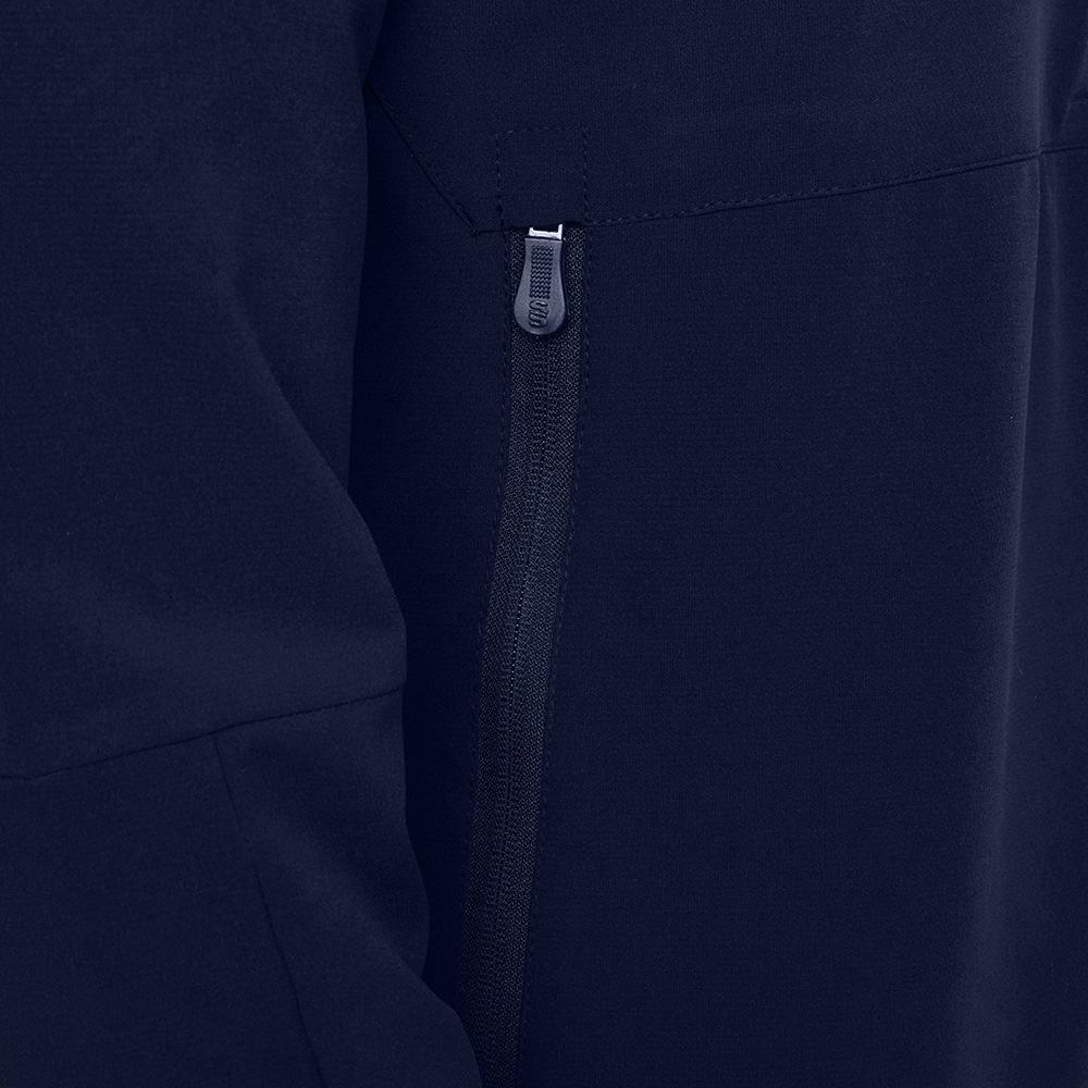 Modern overhead rain jacket with hood. The hoody is lined and the body is lined in the same material which has a light brush to a little warmth. The arms are well fitted for a modern look. Both front pockets are over sized with the same brushed lining for extra warmth. The material is matt and is water repellent. This is only showerproof.